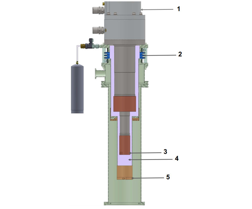 The closed cycle cryocooler (1) is independently mounted from the system, connected to the laboratory interface only by soft rubber bellows (2). The cryocooling stage (3) cools helium gas (4) in the interface, convectively cooling the heat exchanger (5). The sample is placed in the laboratory interface (shaded green) on the opposite side of the heat exchanger (5), enjoying ultra-low vibrations.